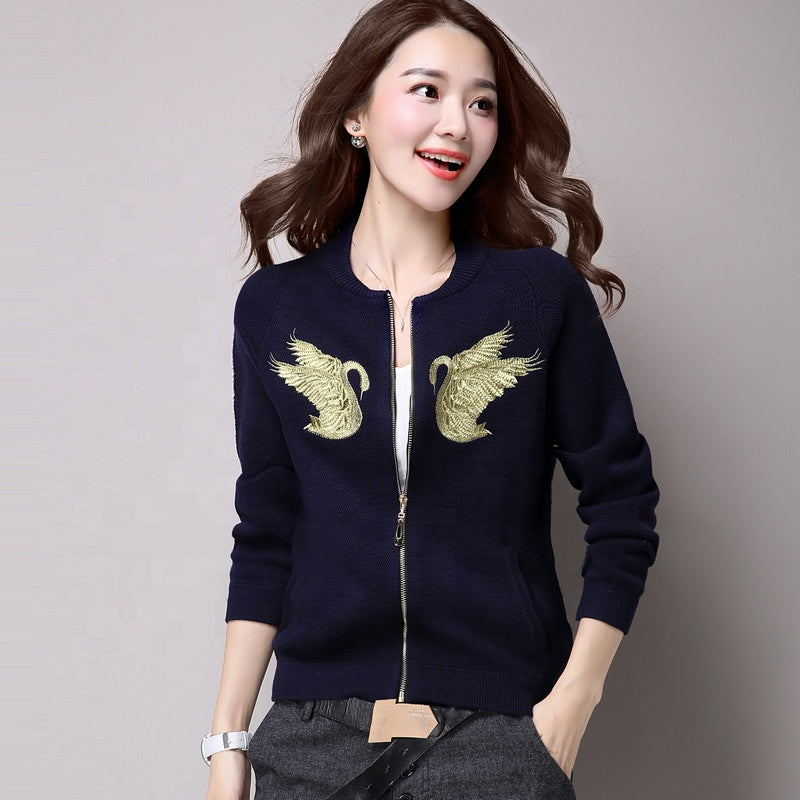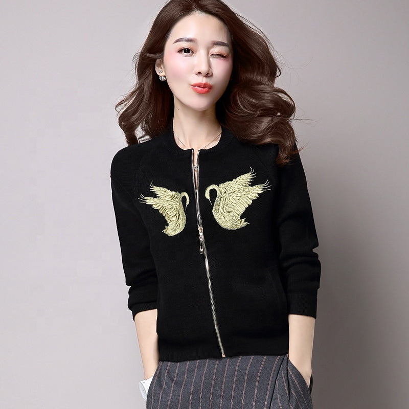 Women's long-sleeved zipper embroidered simple cardigan jacket